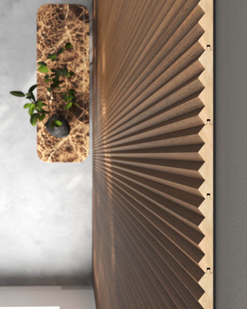di una canna di bambù in sezione longitudinale. Noi vediamo una boiserie contemporanea che movimenta la parete rendendola protagonista.