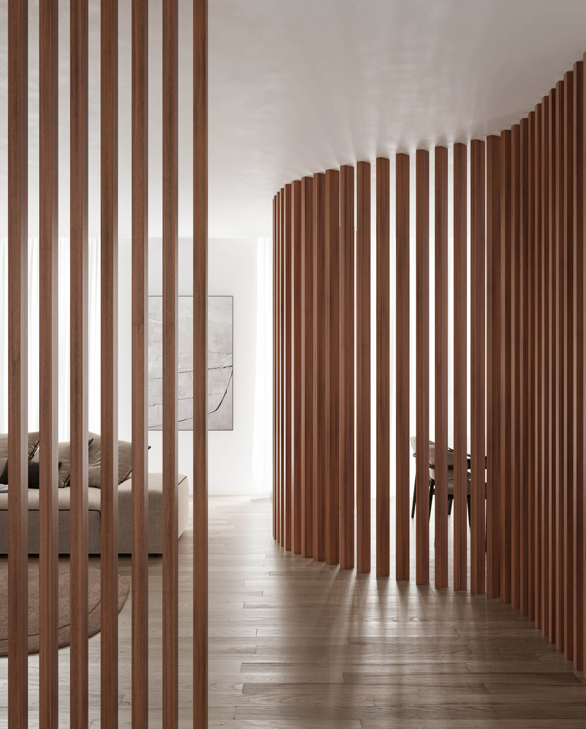 Interlocking wooden slats for the realisation of partitions or room dividers.Slats can be rotated.Available unfinished, in oak and teak finish, or lacquered in any RAL/NCS colour